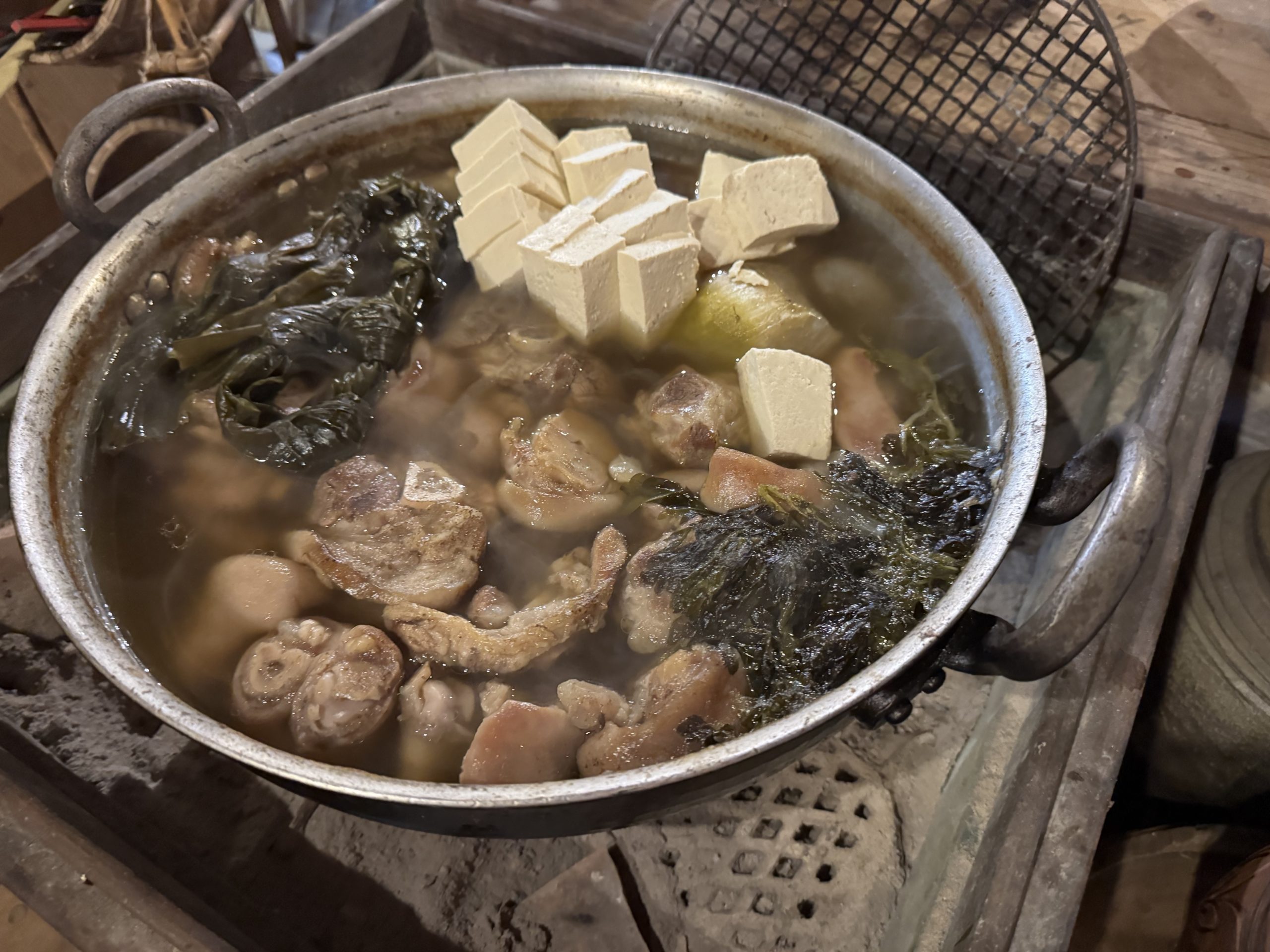 Rice from Asai-san. Indigenous yam from Yonaguni, Yam from Akaishi (Ishigaki), Spanish mackerel jerky and Tuna jerky from Minami-Daito,  Millet from Hateruma, Taro and its stem from Kin. Ffumami (black peas) from Miyako, Indigenous turnip leaves, Sugarcane from Kouri island, Daikon radish leaves, Papaya, Island carrot, Purple sweet potato, Pork trotters, Salt from Yonaguni, e.t.c…